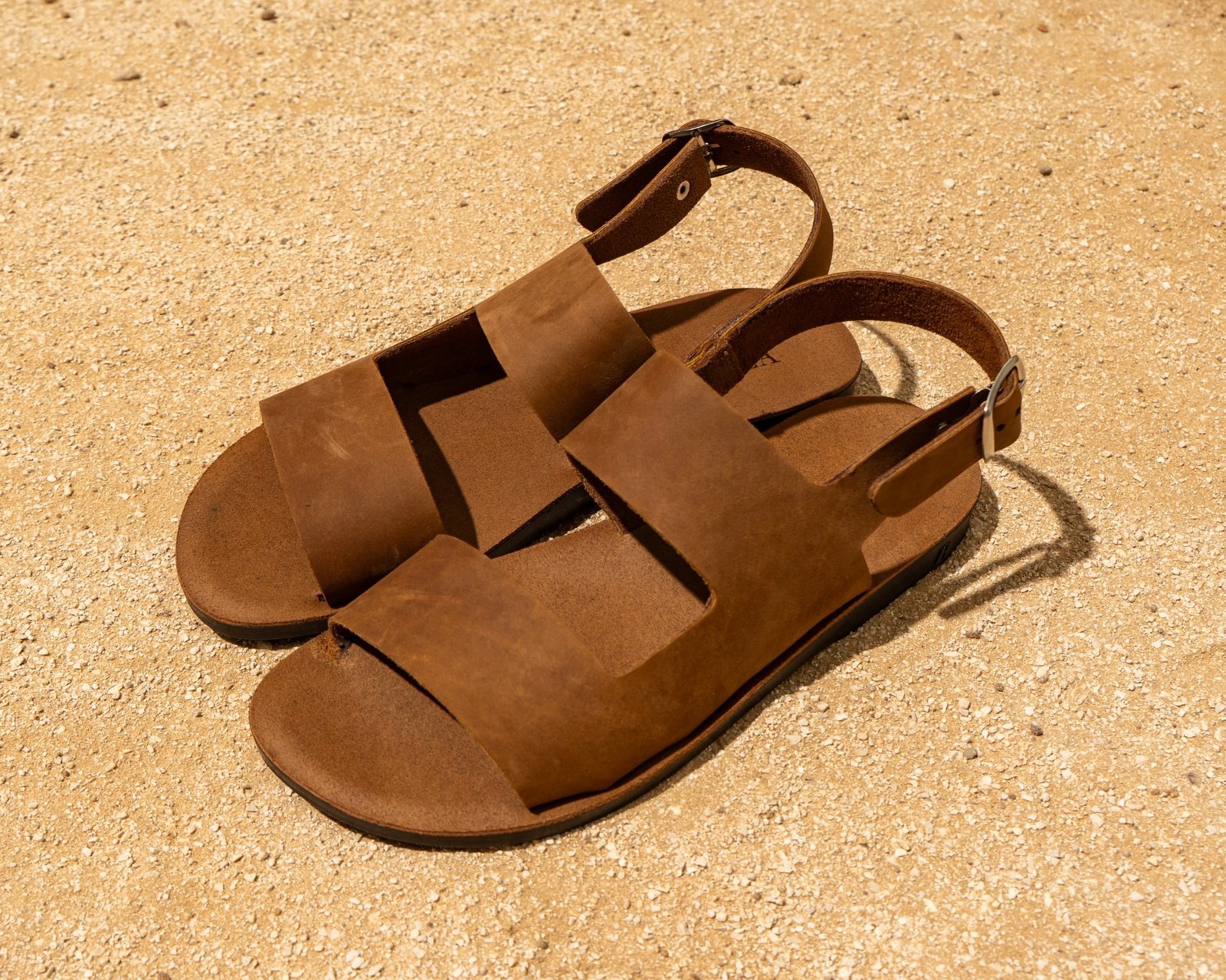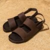 סנדל בצבע קאמל ג׳ינג׳י בשילוב סוליה שטוחה ואבזם כסוף