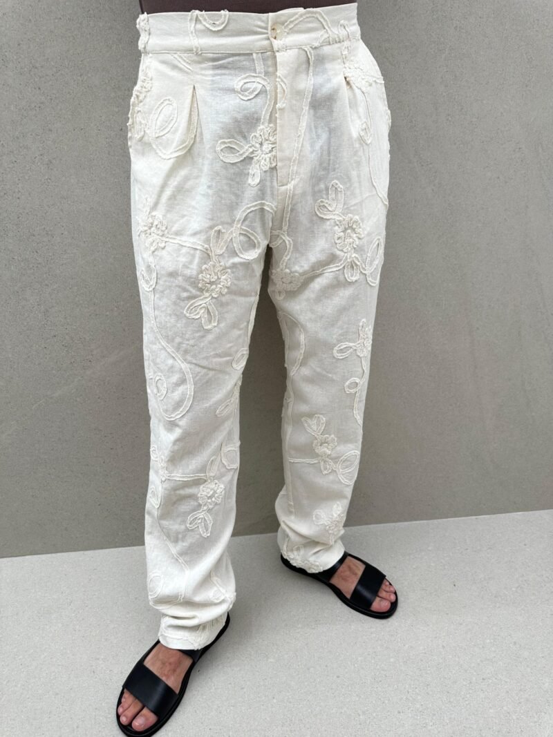 מכנסיים מתוך קולקציית קפסולה עשוייה מבד כותנה בשילוב ריקמה פירחונית